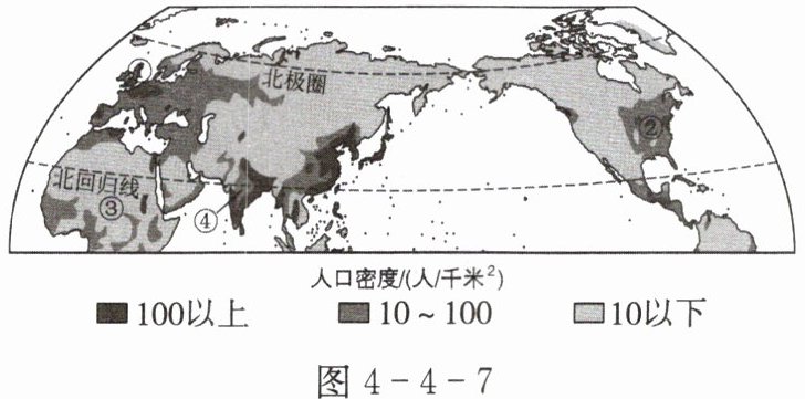 16. (广西贵港模拟)图4-4-7为世界人口密度分布图(局部地区),完成下列各题。