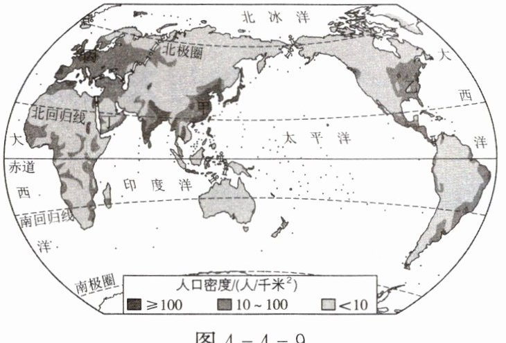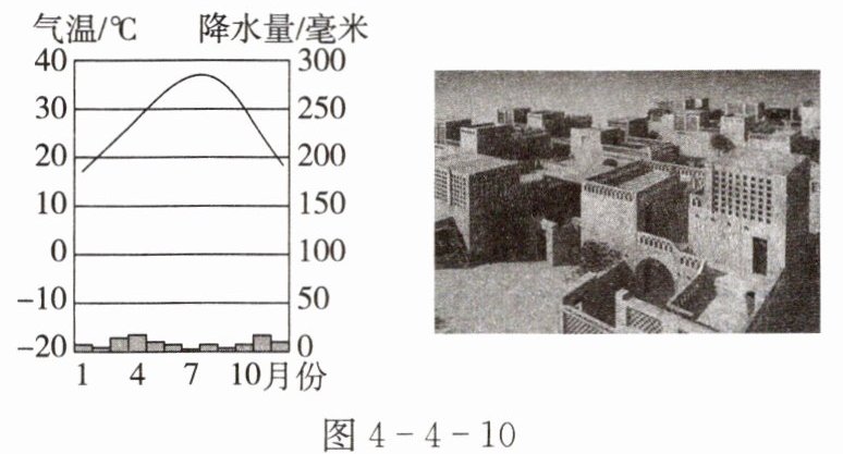 18. (北京大兴统考)地理课上同学们探究世界的居民与文化。图4-4-9为世界人口分布图,图4-4-10为丁地气温曲线和降水量柱状图及当地传统民居景观。阅读图文资料,回答下列各题。