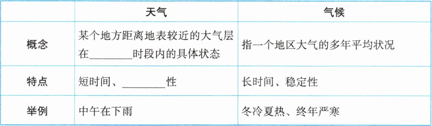 时段内的具体状态 | 指一个地区大气的多年平均状况 || 特点 | 短时间、