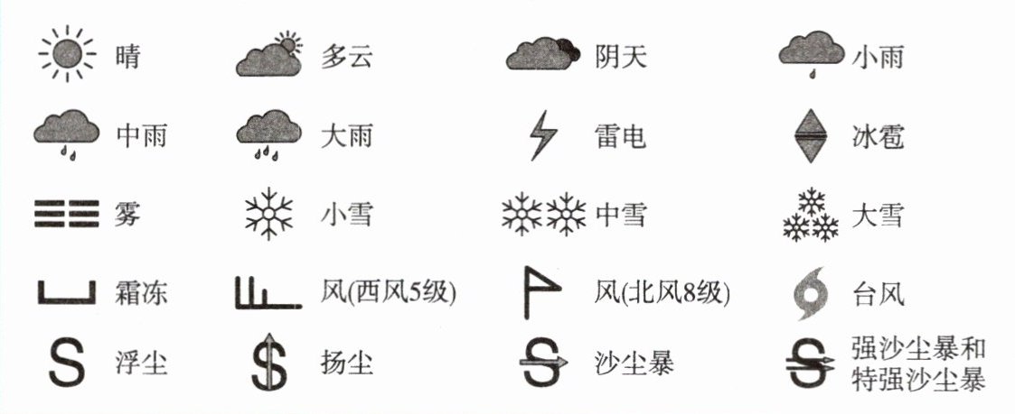 | 天气符号 | 晴 多云 阴天 小雨 中雨 大雨 雷电 冰雹 雾 小雪 中雪 大雪 霜冻 风(西风5级) 风(北风8级) 台风 浮尘 扬尘 沙尘暴 强沙尘暴和特强沙尘暴 |
