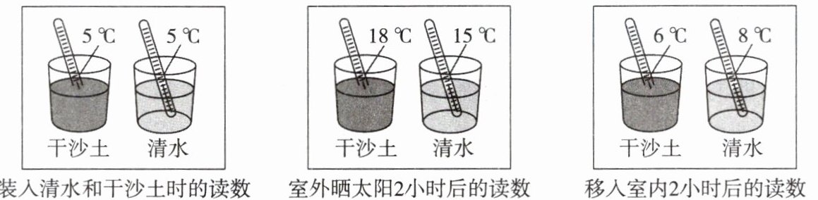 (“干沙土”或“清水”)升温快。②比较干沙土和清水,从室外移到室内2小时后,