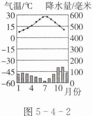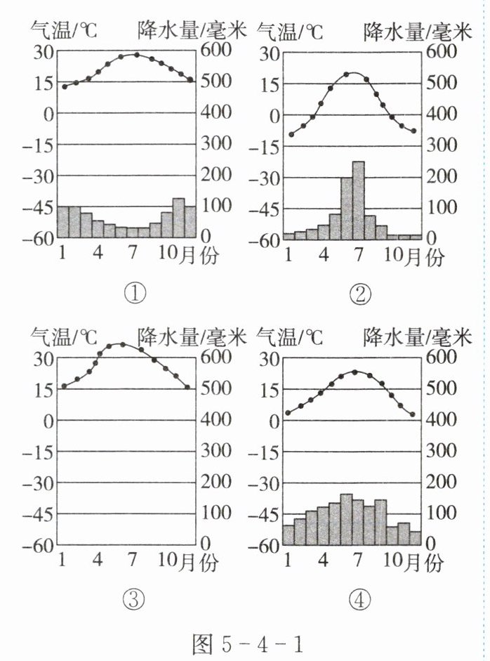 1. 华北平原地处温带季风气候区,图5-4-1中符合华北平原气候特征的是(