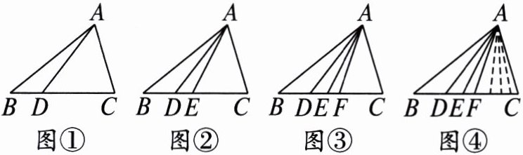 (4)如图④,在边 $ BC $ 上取 $ n $ 个点 $ D $,$ E $,$ F $,…$$,连接 $ AD $,$ AE $,$ AF $,…$$,则图中共有多少个三角形?