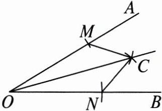 (2)分别以点M,N为圆心,____的长为半径作弧,两弧在∠AOB的____相交于点C。