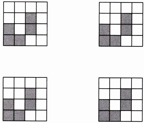 5. 如图,在 $ 4 × 4 $ 的正方形方格中,阴影部分是由涂黑的小正方形所组成的图案。现要求将方格内空白的两个小正方形涂黑,使得到的新图案成为一个轴对称图形,请在下面的图中至少画出四种不同的方案,并画出对称轴。