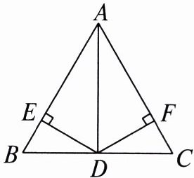 3. 如图,在等边三角形 ABC 中,AD 是 BC 边上的中线,DE⊥AB 于点 E,DF⊥AC 于点 F,若 DE = 2,则 DF = ____。