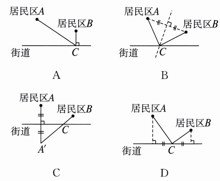 1. 小王准备在街道旁建一个送奶站,向居民区 $ A $,$ B $ 提供牛奶,要使 $ A $,$ B $ 两小区到送奶站的距离之和最小,则送奶站 $ C $ 的位置应该在( )