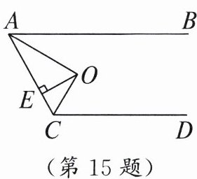 15. 如图,$AB// CD$,$O为\angle BAC$,$\angle ACD$的平分线的交点,$OE\perp AC于点E$,且$OE = 1$,则$AB与CD$之间的距离等于______.