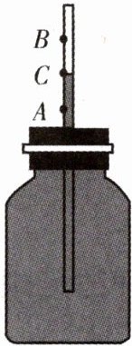 (3)给温度计标刻度时,将小药瓶分别放在$20^{\circ}C和60^{\circ}C$的水中,并标记液面稳定时的位置$A和B$,则$20^{\circ}C$对应的是______(选填“$A$”或“$B$”);把小药瓶放入另一杯温水中,标记液面稳定时的位置为$C$点,用刻度尺测出$AB间距为8cm$,$AC间距为5cm$,则标记$C$点所对应的温度为______$^{\circ}C$。(忽略温度计制作工艺的影响)