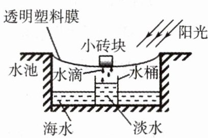 12. 温室效应会导致全球变暖,使全球冰川____,海面上升,低地被淹,影响城市供水。生活在海边的小星同学设计了一种简便的淡化海水的方法:在地上挖一个水池,往池内灌入海水,按照如图所示完成设备的安装,在阳光照射下池内的海水经过____后,在塑料膜上____形成小水滴,小水滴滑到最低处滴入桶中得到淡水。(均填物态变化名称)