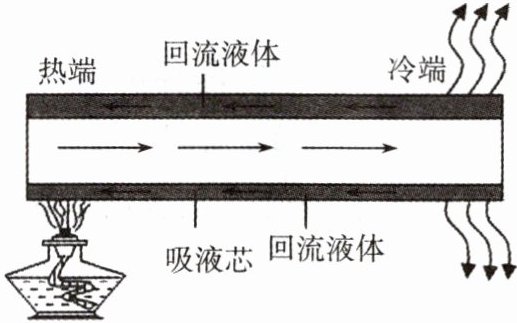 7. 如图所示是热管的工作原理图,当热管的热端受热时,吸液芯里的液体吸收热量变成蒸气,这一过程叫____(填物态变化名称),蒸气在管子里跑到冷端____热量变成液态,液体通过吸液芯又回到热端。这一过程循环进行,不断地将热量从热端带到冷端。