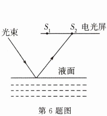 6. 有一光电控制液面高度的仪器,是通过光束在液面上的反射光打到电光屏(将光信号转化为电信号进行处理)上来显示液面高度的。如图所示,与液面夹角为60°的光束经液面反射后在光屏上形成光点$S_2,$反射角的大小为_________,一段时间后光点由$S_2$移到$S_1$时,则该液面_________(选填“上升”或“下降”)了。