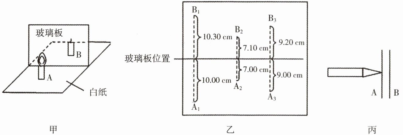 (3)小星想确定家中穿衣镜成像的反射面,他将笔尖紧贴镜面A,如图丙所示,发现笔尖的像与笔尖之间有一段距离,说明镜面____(选填“A”或“B”)是反射面。