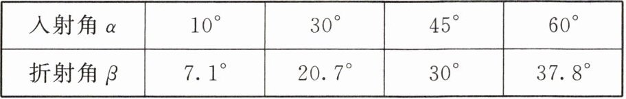 |折射角$\beta$|$7.1^{\circ}$|$20.7^{\circ}$|$30^{\circ}$|$37.8^{\circ}$|