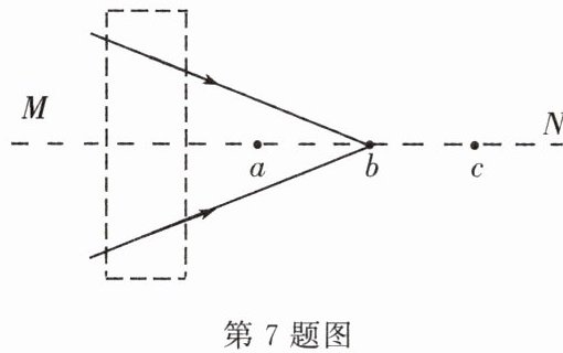 7. 如图所示两条光线会聚于主光轴MN上的b点,在虚线框内放入甲透镜后光线将会聚于c点;放入乙透镜后,光线将会聚于a点。则甲是____透镜,乙是____透镜。