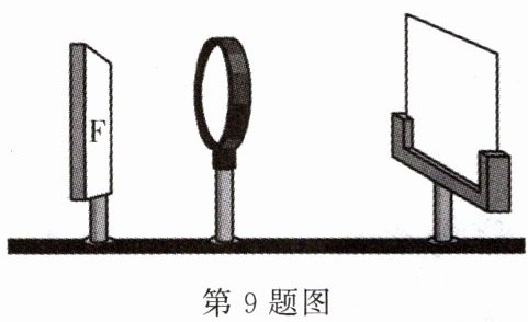 9. 某实验小组探究凸透镜成像的规律。实验过程中,将“F”光源、凸透镜和光屏按如图所示位置放置时,光屏上呈现清晰的“F”光源的像,此时像是倒立、____的。若保持其中两个元件的位置不变,只要移动____,光屏上就有可能再次呈现清晰的“F”光源的像。
