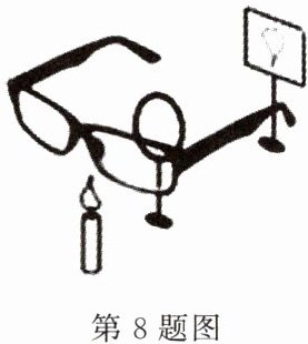8. 小星将一支点燃的蜡烛放在凸透镜($f= 10cm$)前18cm处,光屏上得到了烛焰倒立、____的实像。然后他在蜡烛和凸透镜之间放置了一个远视眼镜片,如图所示,由于远视眼镜片对光线有____作用,