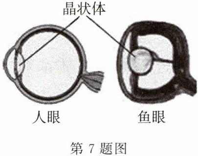 7. 如图所示是人眼与鱼眼的结构示意图。人的眼球好像一架照相机,晶状体和角膜的共同作用相当于一个____透镜;我们观察发现,鱼眼晶状体的形状比人眼更加凸一些,折光能力会更强一些,如果人眼的晶状体像鱼这样,观察远处的物体时,将成像在视网膜的____面,若要看清远处的物体,应该佩戴____透镜来进行矫正。