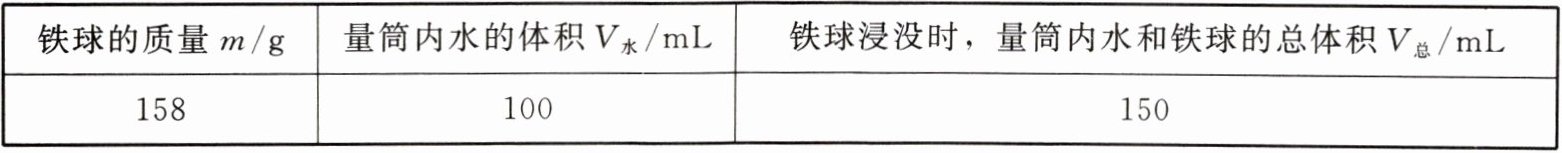 | 铁球的质量 $ m/g $ | 量筒内水的体积 $ V_{水}/mL $ | 铁球浸没时,量筒内水和铁球的总体积 $ V_{总}/mL $ |