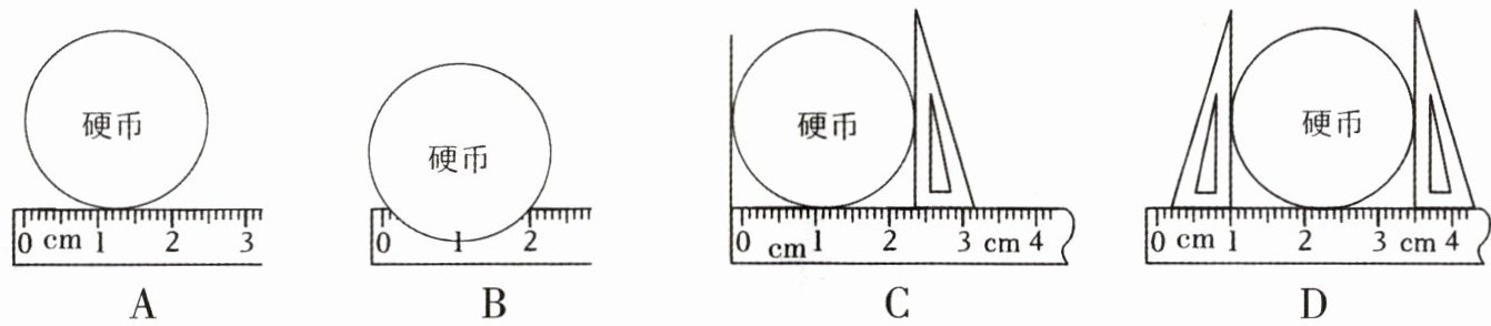 3. 小湘设计了测量硬币直径的方案。下图测量方案正确的是( )