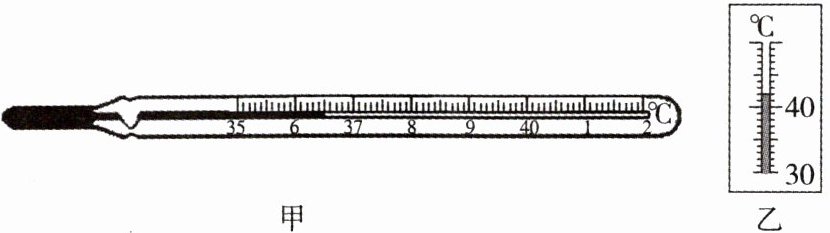 11. 如图甲所示,体温计的示数为______$^{\circ}C$;乙图中温度计的示数为______$^{\circ}C$。