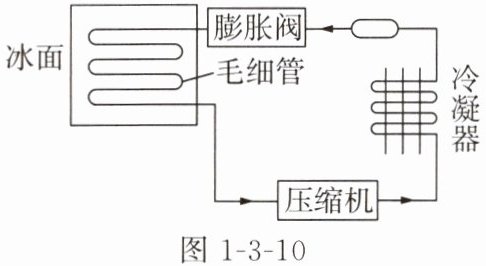 1. 【时代科技】为了践行“绿色冬奥”的理念,国家速滑馆“冰丝带”采用了二氧化碳跨临界直冷制冰技术,使碳排放量接近于零。原理如图1-3-10所示,首先液态二氧化碳通过膨胀阀进入毛细管,在毛细管中迅速______(填物态变化名称)变成气态,此时在制冰管上方的平面上洒水,水在平面上凝固______(选填“吸热”或“放热”),从而完成制冰;之后气态二氧化碳在压缩机的推动下进入冷凝器,在冷凝器中______(填物态变化名称)变成液态,完成一个循环。