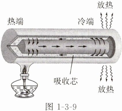 4. 【时代科技】图1-3-9是热管的工作原理图,当热管的热端受热时,吸收芯里的液体吸收热量变成蒸气,这一过程叫______(填物态变化名称),蒸气在管子里运动到冷端______(选填“吸收”或“放出”)热量变成液体,液体通过吸收芯又回到热端。这一过程循环进行,不断地将热量从热端带到冷端。