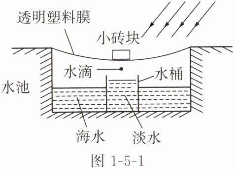 3. 海水淡化可有效解决用水问题。海水淡化的方法中有一种称为“蒸馏法”,即在地上挖一个水池,往池内灌入海水,按照如图1-5-1所示完成设备的安装。在阳光照射下,池内的海水______(选填“吸热”或“放热”)______(填物态变化名称)变为水蒸气;水蒸气遇到塑料膜______(选填“吸热”或“放热”)______(填物态变化名称)形成小水滴,小水滴沿塑料膜滑到最低处滴入桶中从而得到淡水。