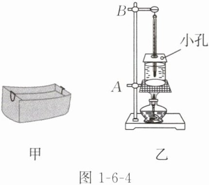 (1)如图 1 - 6 - 4 乙所示,在安装实验器材时,老师提醒大家固定夹 $A$ 和 $B$ 的高度都要适当,固定夹 $A$ 高度适当的标准是保证能够用酒精灯外焰加热,那么固定夹 $B$ 高度适当的标准是____。