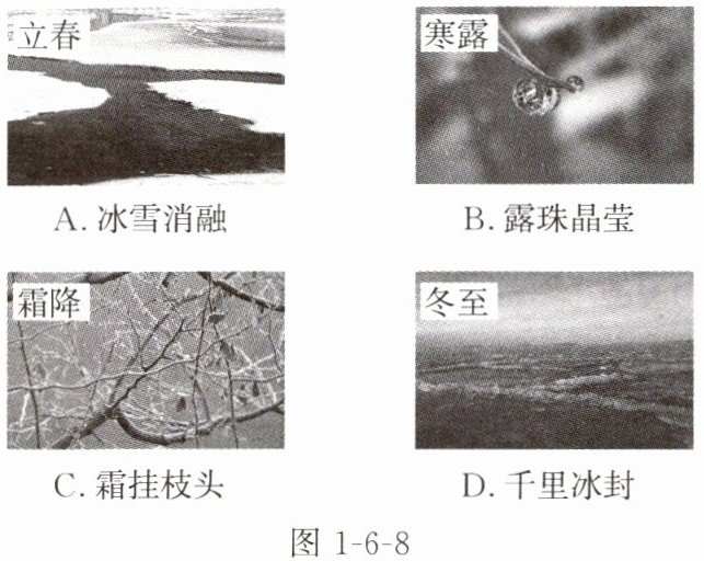 3. (山东德州中考)四季更替,岁月变迁,二十四节气是中华民族智慧的结晶。图 1 - 6 - 8 中的现象属于液化形成的是( )。