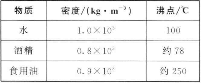 | 物质 | 密度/(kg·m⁻^3) | 沸点/^{\circ}C |