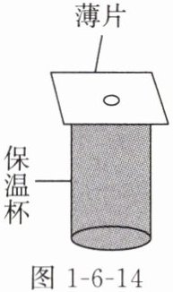 (2)小华做了如图 1 - 6 - 14 所示的改进,用热水改变酒精的温度。在保温杯内加满 $70^{\circ}C$ 的热水,用薄片盖在保温杯上且与水面充分接触,将 $0.1$ mL 酒精滴在薄片上,记录酒精完全蒸发所用的时间。保持其他条件相同,换用 $70^{\circ}C$ 以下不同温度的热水多次实验。为了让酒精温度快速达到相对应的水温,他可选择____(选填“塑料”或“铝”)薄片进行实验,理由是____。