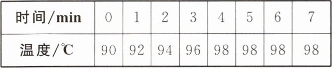 (2)实验中待水温接近 $90^{\circ}C$ 时每隔 $1$ min 记录一次温度,待水沸腾后再记录四次,并填写在下表中。分析实验数据可知,水的沸点为____$^{\circ}C$,此时实验室的气压____(选填“高于”“等于”或“低于”)标准大气压。实验中在烧杯口处看到大量“白气”,“白气”的形成是____(填物态变化名称)现象。