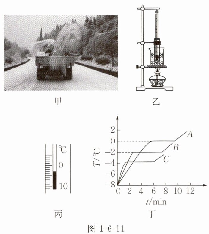 (3)完成上述实验后,小张又取了适量淡盐水制成的碎冰,用相同的热源再次加热,得到图 1 - 6 - 11 丁中的 $B$ 图线。再次取适量浓度更大一些的盐水制成的碎冰,用相同的热源加热,得到图 1 - 6 - 11 丁中的 $C$ 图线。由以上实验可知,加入盐后冰的熔点将会____(选填“升高”“降低”或“不变”)。