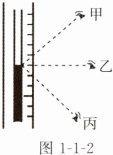 7. 如图1-1-2所示,温度计的刻度线与玻璃管中的液柱存在一小段距离,所以读取示数时如果视线的角度不正确,就得不到正确的数据。图1-1-2中甲、乙、丙三种读数方法正确的是____,读取示数偏大的是____,读取示数偏小的是____。(均选填“甲”“乙”或“丙”)