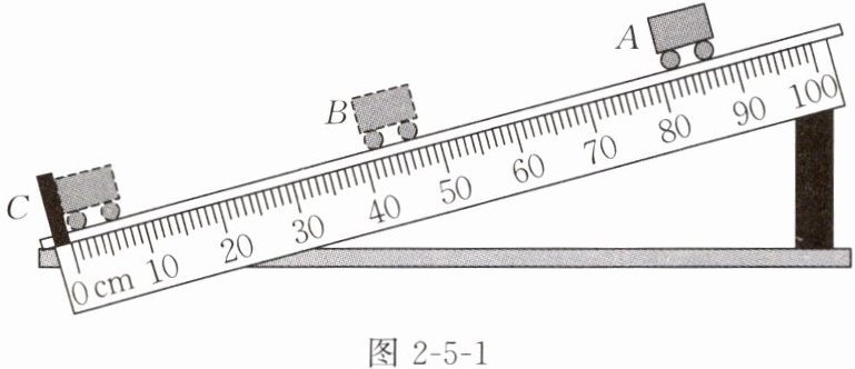 2. 在“测量平均速度”实验中(如图2-5-1所示),选择较小坡度的斜面,是为了便于测量______。让小车从斜面上的A点由静止开始下滑,测出小车到达B点所用的时间为2s,则AB段的路程$s_{AB}= $______cm,小车在AB段的平均速度为______cm/s。如果在某次测量中小车过了B点才停止计时,则测得AB段的平均速度会偏______。