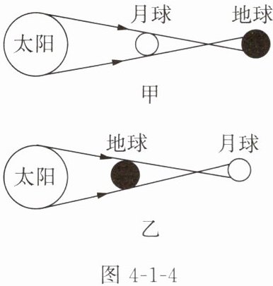 6. 从物理学角度来说,日食属于光的____现象。图4-1-4中能描述日食形成原因的是____(选填“甲”或“乙”)。