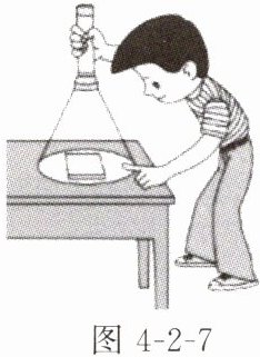 4. 晚上,在桌面上铺一张白纸,把一块小平面镜平放在纸上,让手电筒的光正对着平面镜照射,如图 4-2-7 所示,从侧面看去( )。