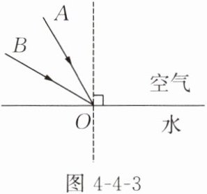 2. 如图 4 - 4 - 3 所示,一束光从空气斜射到水面,若入射方向由 $BO$ 变成 $AO$,则( )。