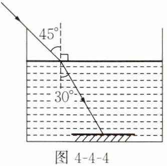 4. 如图 4 - 4 - 4 所示,光从空气射入某液体中,入射角为 $45^{\circ}$,折射角为 $30^{\circ}$。光射到液体底部放置的平面镜上又反射回来,最后光又回到空气中,这时折射角为( )。