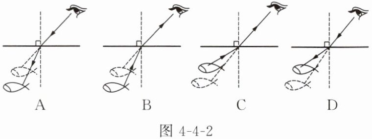 2. 图 4 - 4 - 2 中能正确表示人眼看到水中鱼的光路图是( )。