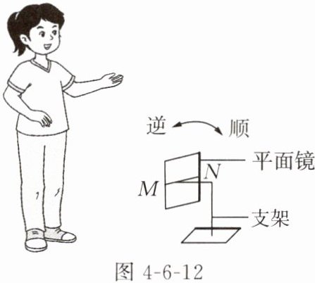 9. (江苏镇江中考)如图4-6-12所示,竖直放置的平面镜能绕水平轴MN转动,小兰站在平面镜正前方,她在镜中成的是______(选填“实”或“虚”)像;小兰垂直镜面移动8cm,她与像的距离改变______cm;为了让她站着就能看到镜中脚的像,可以让平面镜绕轴沿______时针方向转动。