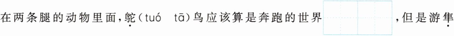在两条腿的动物里面,鸵(tuó tā)鸟应该算是奔跑的世界$\begin{array}{|cc|}\hline guàn & jūn \\ \hline & \\ \hline\end{array}\\ \hline & \\ \hline $,但是游