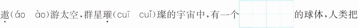 遨(áo ào√)游太空,群星璀(cuī cuǐ√)璨的宇宙中,有一个$\begin{array}{cc}\mathrm{j}ī\mathrm{n}\mathrm{g}& \mathrm{y}í\mathrm{n}\mathrm{g}\\ \hline & \hline\end{array}\\ \hline & \hline $的球体,人类把她视为$\begin{array}{cc}\mathrm{y}á\mathrm{o}& \mathrm{l}á\mathrm{n}\\ \hline & \hline\end{array}\\ \hline & \hline $,更把她比作$\begin{array}{cc}\mathrm{h}é& \mathrm{ǎ}\mathrm{i}\\ \hline & \hline\end{array}\\ \hline & \hline $的母亲,她$\begin{array}{cc}\mathrm{k}ā\mathrm{n}\mathrm{g}& \mathrm{k}ǎ\mathrm{i}\\ \hline & \hline\end{array}\\ \hline & \hline 地\begin{array}{cc}\mathrm{g}ò\mathrm{n}\mathrm{g}& \mathrm{x}\mathrm{i}à\mathrm{n}\\ \hline & \hline\end{array}\\ \hline & \hline $给人类生存所需要的资源,她就是地球。地球上的资源不是谁的恩