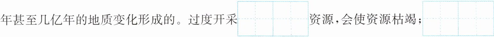 (chì cì√),而是经过几百万年甚至几亿年的地质变化形成的。过度开采$\begin{array}{cc}\mathrm{k}\mathrm{u}à\mathrm{n}\mathrm{g}& \mathrm{c}\mathrm{h}ǎ\mathrm{n}\\ \hline & \hline\end{array}\\ \hline & \hline $资源,会使资源枯竭;$\begin{array}{cc}\mathrm{l}à\mathrm{n}& \mathrm{y}ò\mathrm{n}\mathrm{g}\\ \hline & \hline\end{array}\\ \hline & \hline $化学品,会造成一系列生态灾难,给人类生存带来严重的威胁