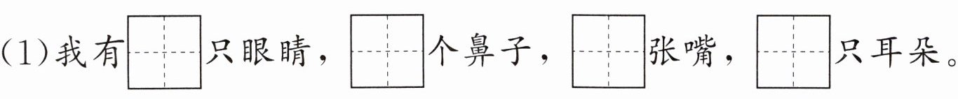 (1) 我有$\begin{array}{|c|}\hline\quad\quad\\\hline\end{array}\begin{array}{|c|}\hline\quad\quad\\\hline $只眼睛$,\begin{array}{|c|}\hline\quad\quad\\\hline\end{array}\begin{array}{|c|}\hline\quad\quad\\\hline $个鼻子$,\begin{array}{|c|}\hline\quad\quad\\\hline\end{array}\begin{array}{|c|}\hline\quad\quad\\\hline $张嘴$,\begin{array}{|c|}\hline\quad\quad\\\hline\end{array}\begin{array}{|c|}\hline\quad\quad\\\hline $只耳朵。