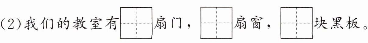 (2) 我们的教室有$\begin{array}{|c|}\hline\quad\quad\\\hline\end{array}\begin{array}{|c|}\hline\quad\quad\\\hline $扇门$,\begin{array}{|c|}\hline\quad\quad\\\hline\end{array}\begin{array}{|c|}\hline\quad\quad\\\hline $扇窗$,\begin{array}{|c|}\hline\quad\quad\\\hline\end{array}\begin{array}{|c|}\hline\quad\quad\\\hline $块黑板。