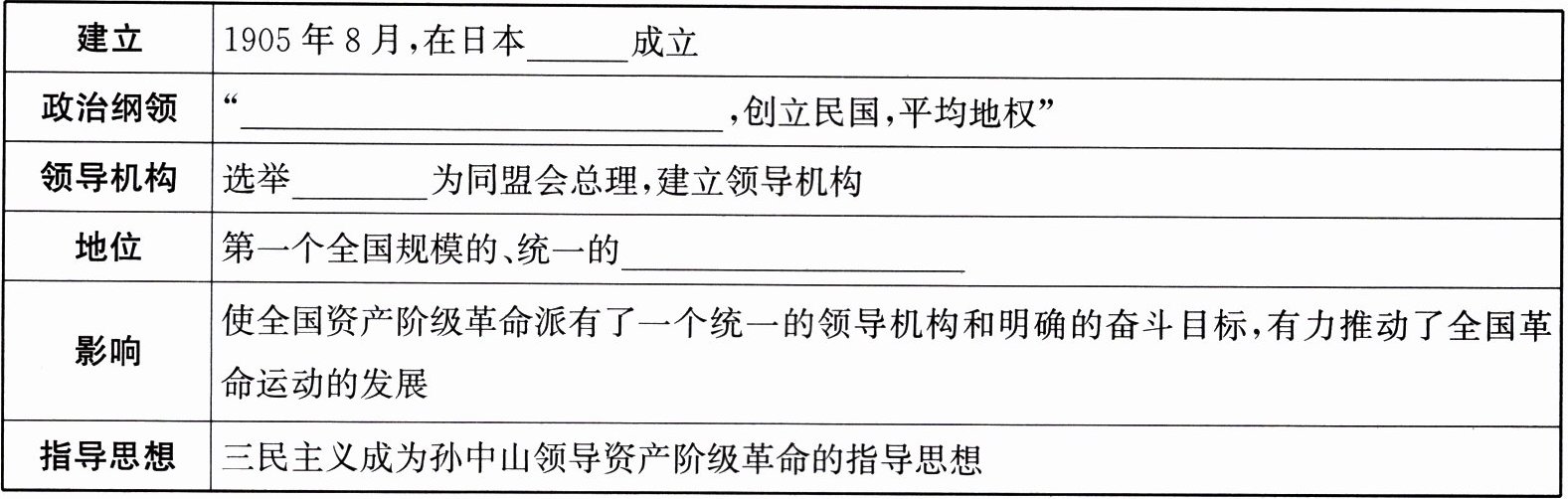 (3)领导准备:在长期的革命斗争中,孙中山的主张逐渐得到其他革命党人的认同,孙中山成为____公认的领袖。