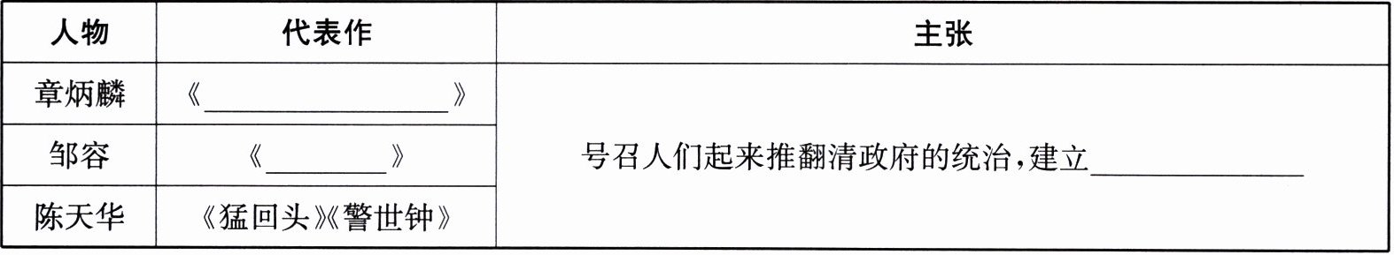 |章炳麟|《____》|号召人们起来推翻清政府的统治,建立____|
