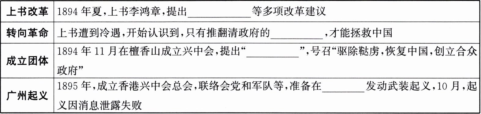 |成立团体|1894年11月在檀香山成立兴中会,提出“____”,号召“驱除鞑虏,恢复中国,创立合众政府”|